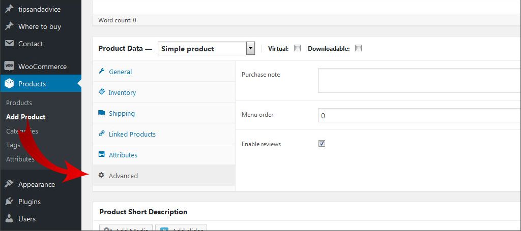 13. Advanced tab: The advanced area allows you to send notes to buyers, arrange the menu order and enable reviews of the product. These are all optional, but keeping reviews enabled is helpful since most shoppers use this to make decisions when making purchases.
