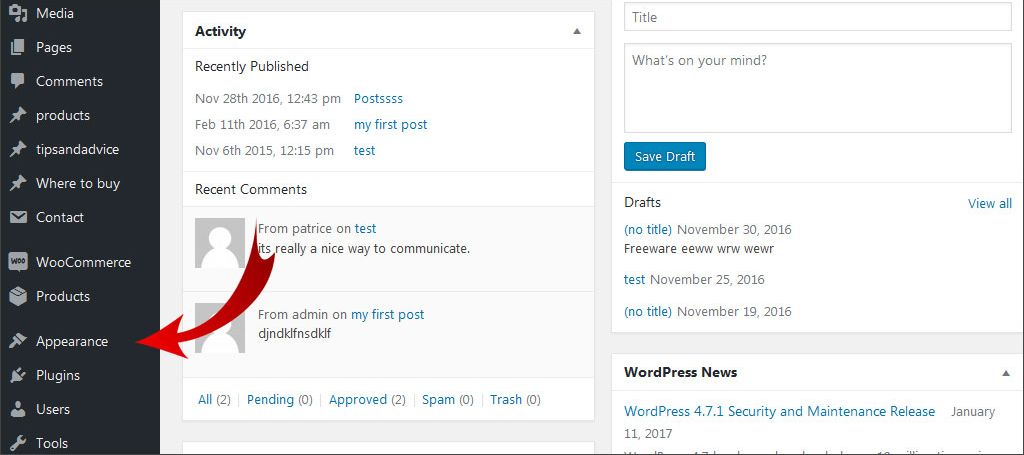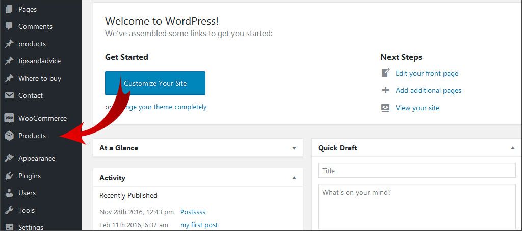 When WooCommerce is installed, it will add two new controls on the left of the admin panel: WooCommerce and Products. These are used to manage your store and will show orders, coupons, reports and more information.