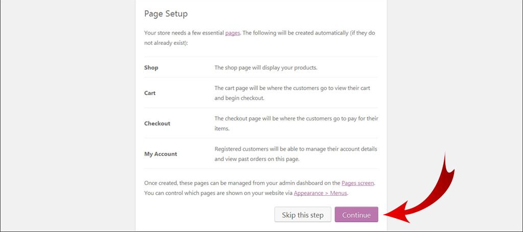4. The next screen shows what pages WooCommerce is going to set up and why they are important. Click the "Continue" button.