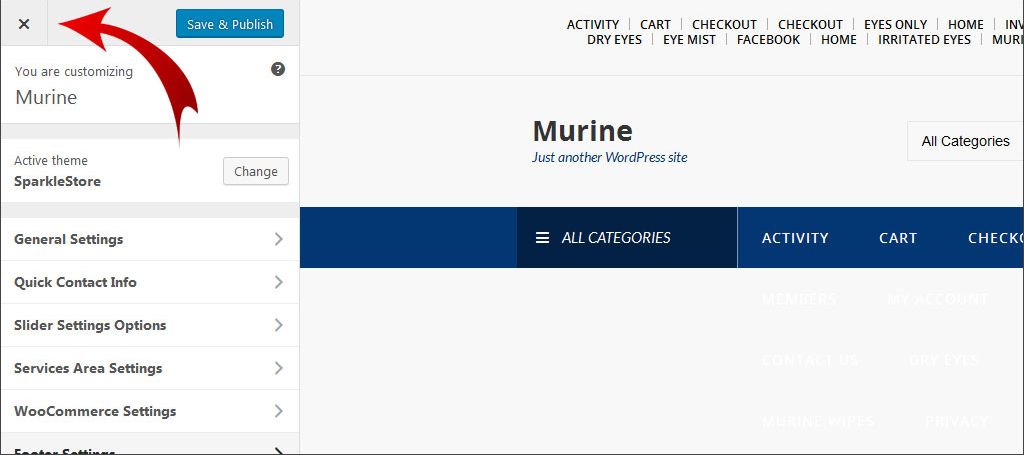 8. Click the large, "X" in the top left corner to return to the WordPress admin panel.
