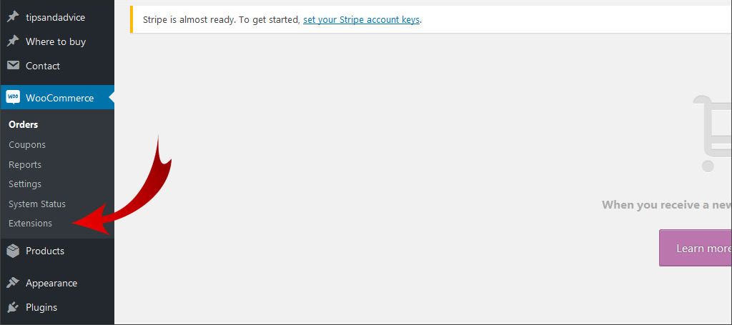 To Access these extensions, go to the WooCommerce area of WordPress and click the "Extensions" link.