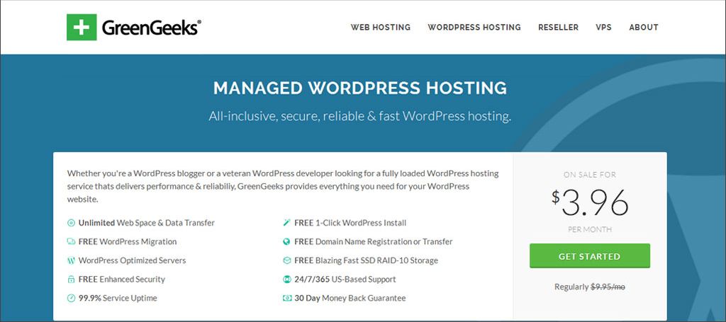 1. Go to the GreenGeeks WordPress Hosting and click the "Get Started" button on the page.