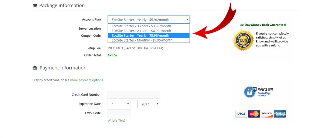 4. Select your hosting plan. This is done in monthly increments, however it saves you money by registering your site for an extended period.
