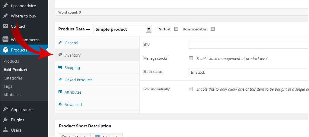 9. Inventory tab: From here, you can set stock quantity, status and backorders. WooCommerce comes with the ability to track stock quantity by clicking the check box next to, "Manage Stock."