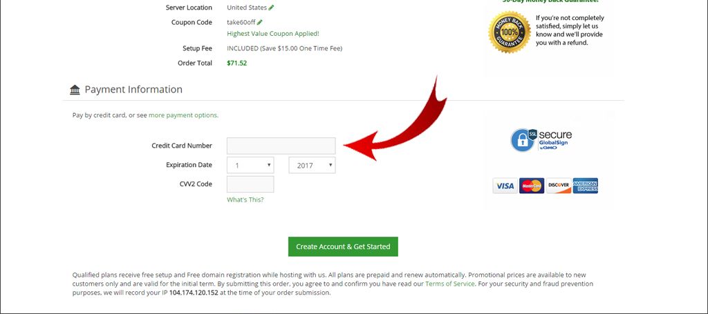 5. Enter your payment information. You can use any Visa, Masetercard, Discover or American Express account to pay for hosting.