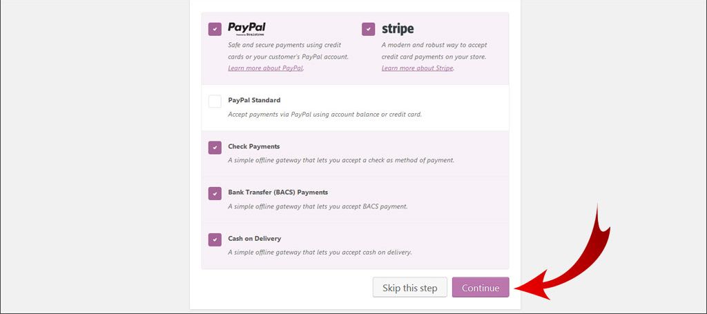 7. Choose your payment options. WooCommerce comes default with PayPal, Stripe and forms of offline payments such as checks or cash-on-delivery. Select all of those you wish to use for purchases. Additional methods can be added later from the "Checkout Settings" control in the WooCommerce area of WordPress. Click the continue button.