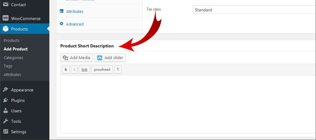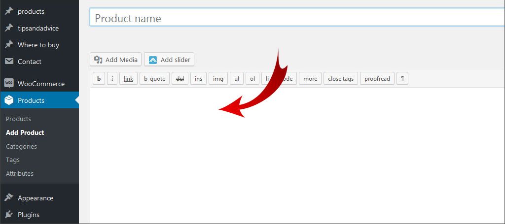 4. In the text field, input a product description. WooCommerce uses the same editing system the rest of WordPress uses. So, you'll have access to any plugins that modify the editor such as TinyMCE Advanced or Yoast SEO. NOTE: You don't want to flood the product description with too much text. It may be wise to keep it between 100 and 300 words depending on the item.