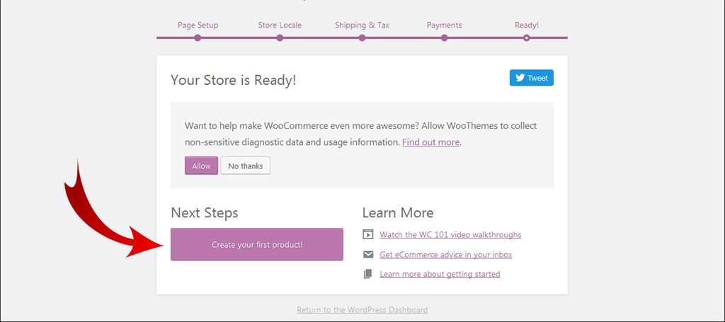 8. In this last screen, you have the option to allow WooCommerce to collect data regarding your site to help developers create future material. This is an optional choice. Otherwise, click the "Create your first product!" button on the bottom left. This will take you back to the WordPress admin panel.