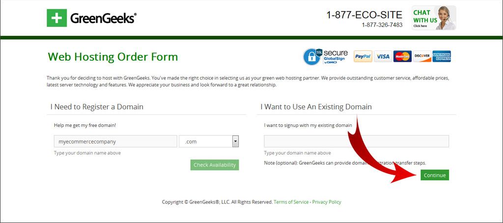 2. On the next screen, you can register a new domain name or use an existing one. Once you make your selections, click the "continue" button on the bottom right. NOTE: When registering a new domain, try to use variations if the one you want is unavailable. Abbreviations or synonyms of words may be helpful.