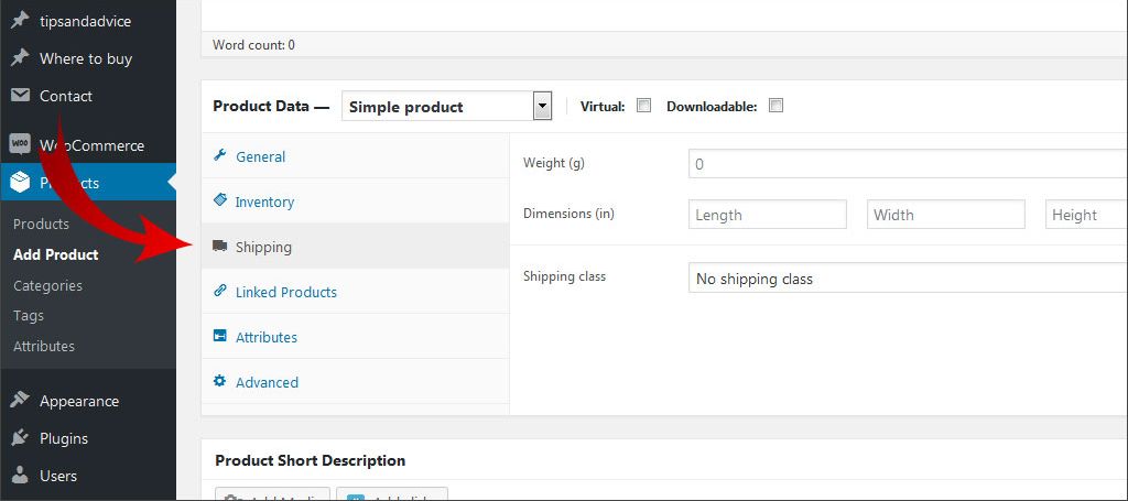 10. Shipping tab: Set the dimensions for shipping a single item. This includes weight, box dimensions and shipping class if you have one set already. The information in this area is to help estimate shipping costs.