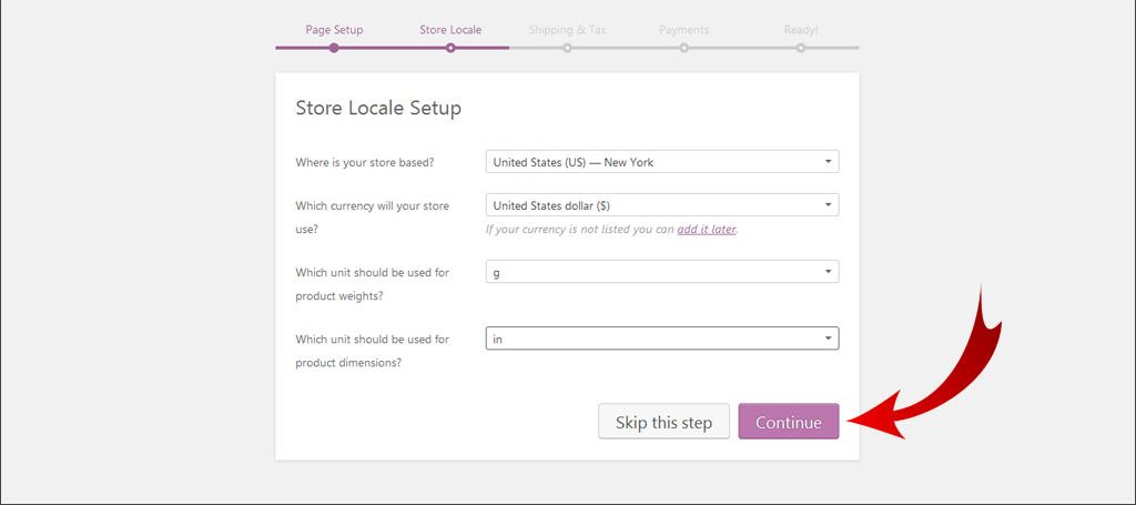 5. Choose the settings for your store locale. This covers physical location, currency type, measurements for weight and product dimensions. Click the continue button once you've made your selections.