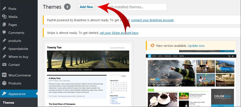 2. Themes, should be the first selection that appears. In this area, click the "Add New" button on the top left.